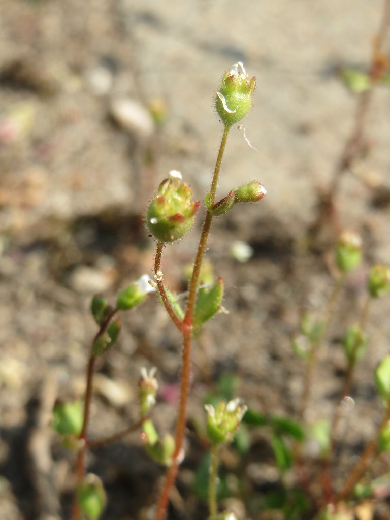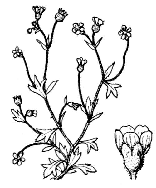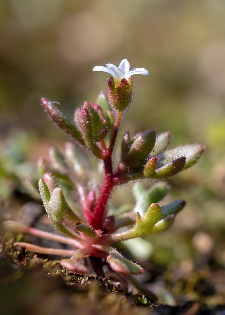 Haut. 2-10 cm. Plante annuelle, glanduleuse-visqueuse, gén. rougeâtre, sans rejets stériles. Feuilles basales, gén. caduques, spatulées ou terminées par 3-5 dents. Feuilles caulinaires à 3 lobes ou indivises. Tige dressée, ramifiée dans le haut, portant plusieurs fleurs. Pédicelles grêles, 2-5 fois plus longs que les fleurs blanches. Pétales longs de 3-5 mm.
